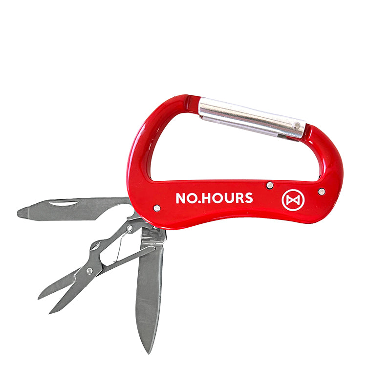 - Multi-tool carabiner with simple NoHours logo branding for a cool, minimalist look