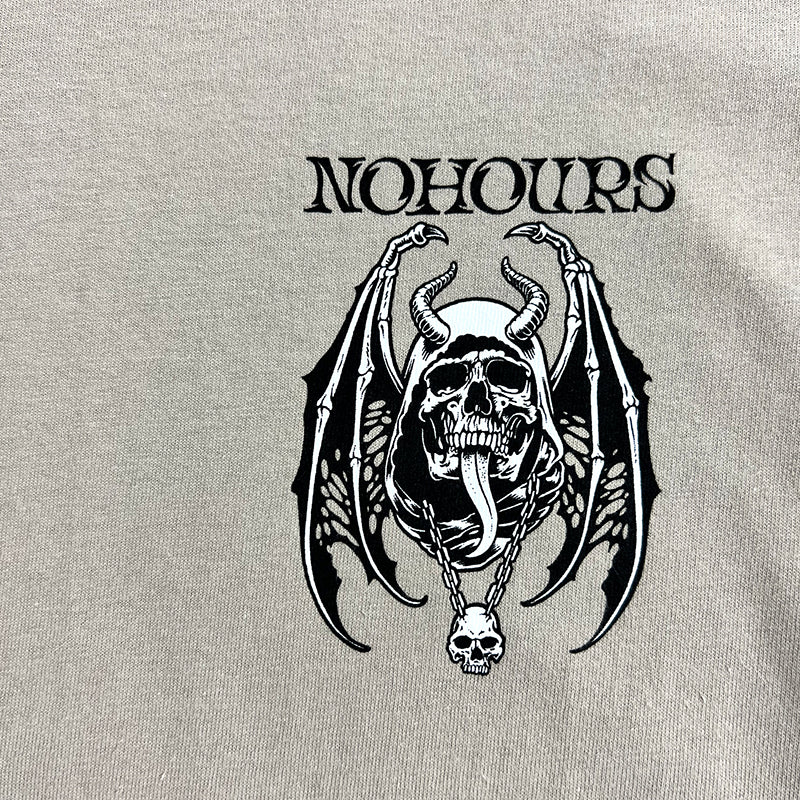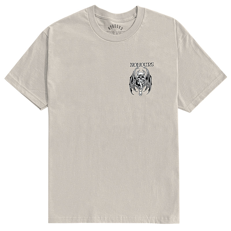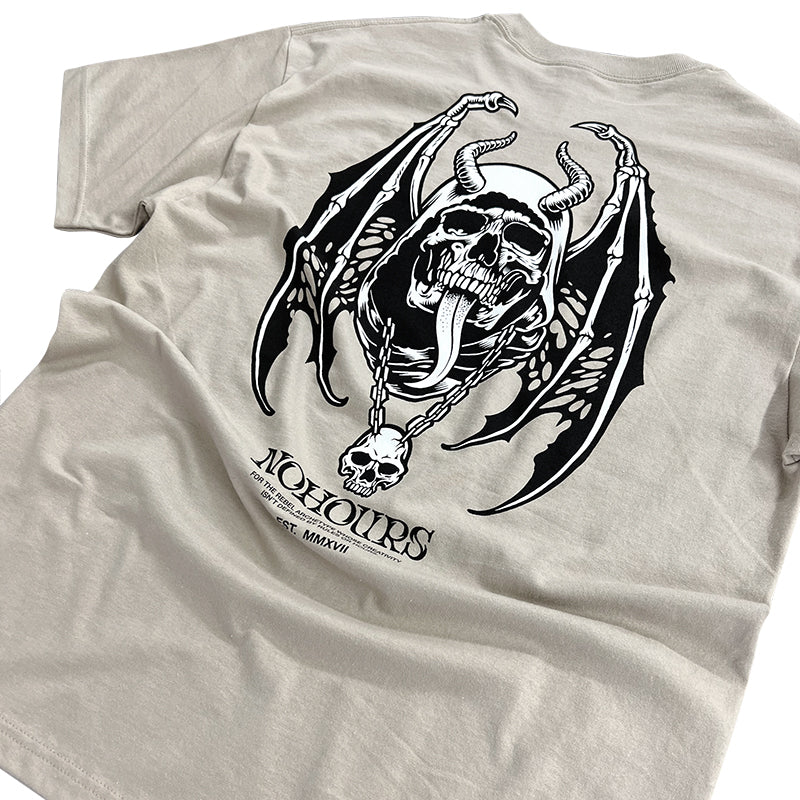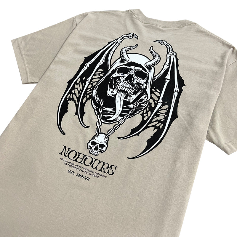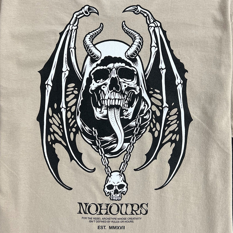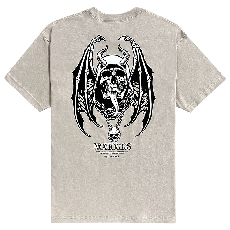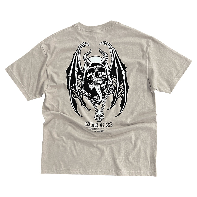 Elevate your style with the Dark Days Tee. Featuring a vintage-inspired design of a winged skull and horns, this tee is perfect for those who embrace the darker side of life. Make a statement and show off your unique taste with this one-of-a-kind shirt.