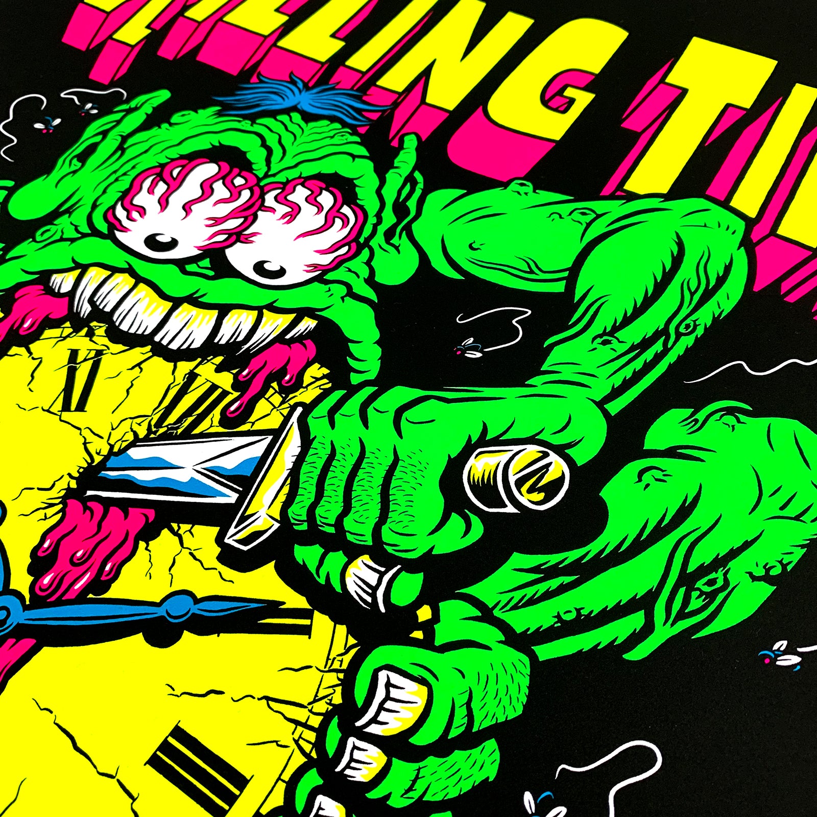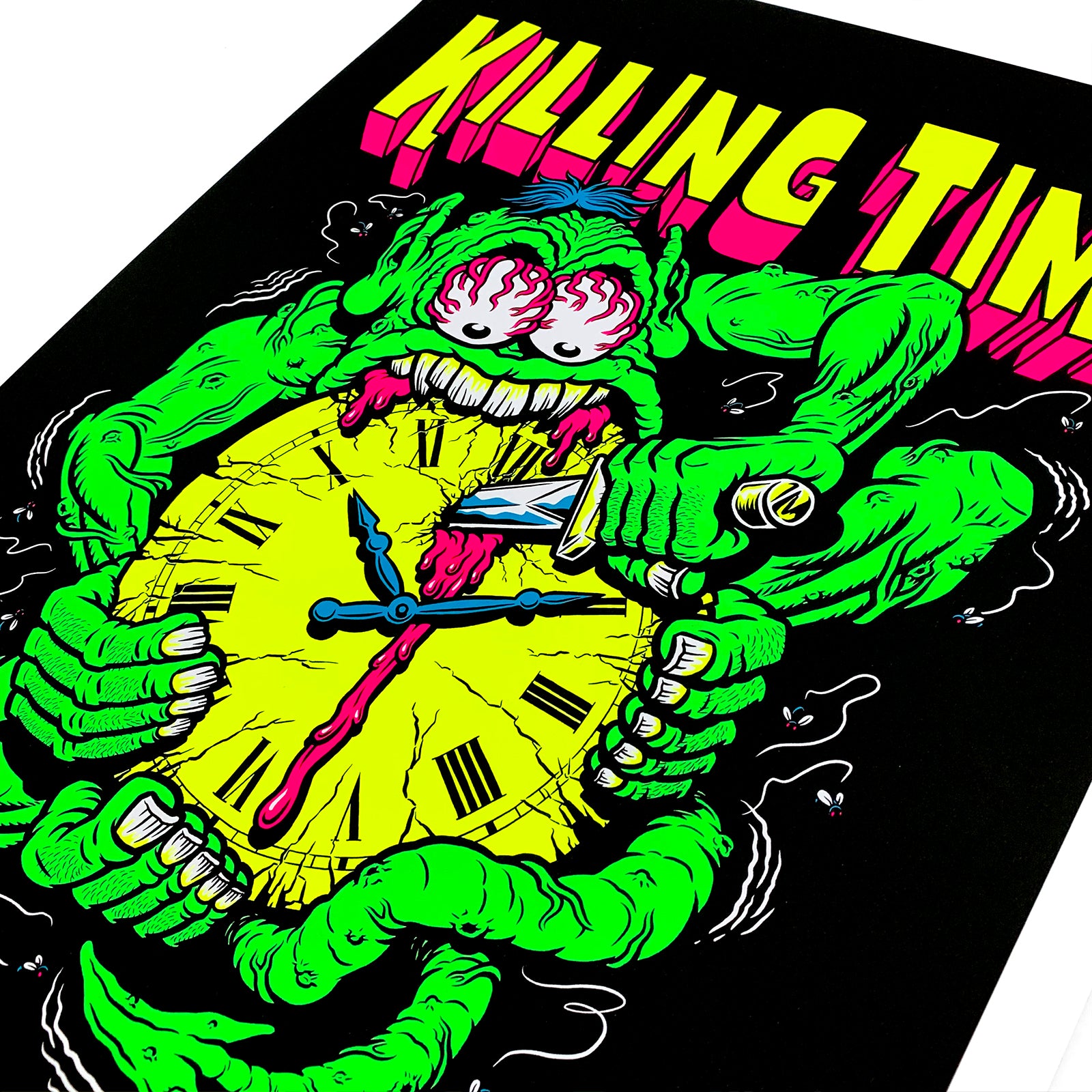 NoHours partners with renowned artist and illustrator, Brian Romero, to bring our popular Killing Time theme to life. This vibrant, day glow monster print is designed to inject life into any space. Its striking aesthetics aren't just for show; it's a visual reminder to seize the day and stop killing time.