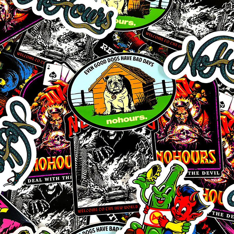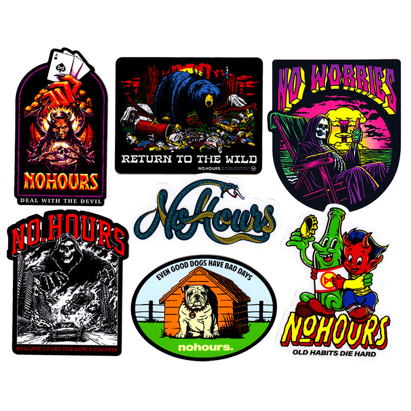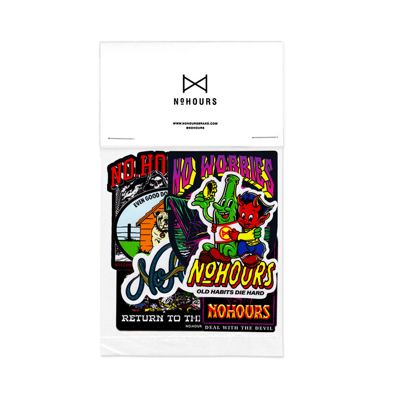 Adorn your skateboard, notebook, laptop, or any surface for that matter with NoHours' Sticker Pack 23. These high-quality dye-cut stickers are designed to pop, resist fading, and stick around for the ride.
